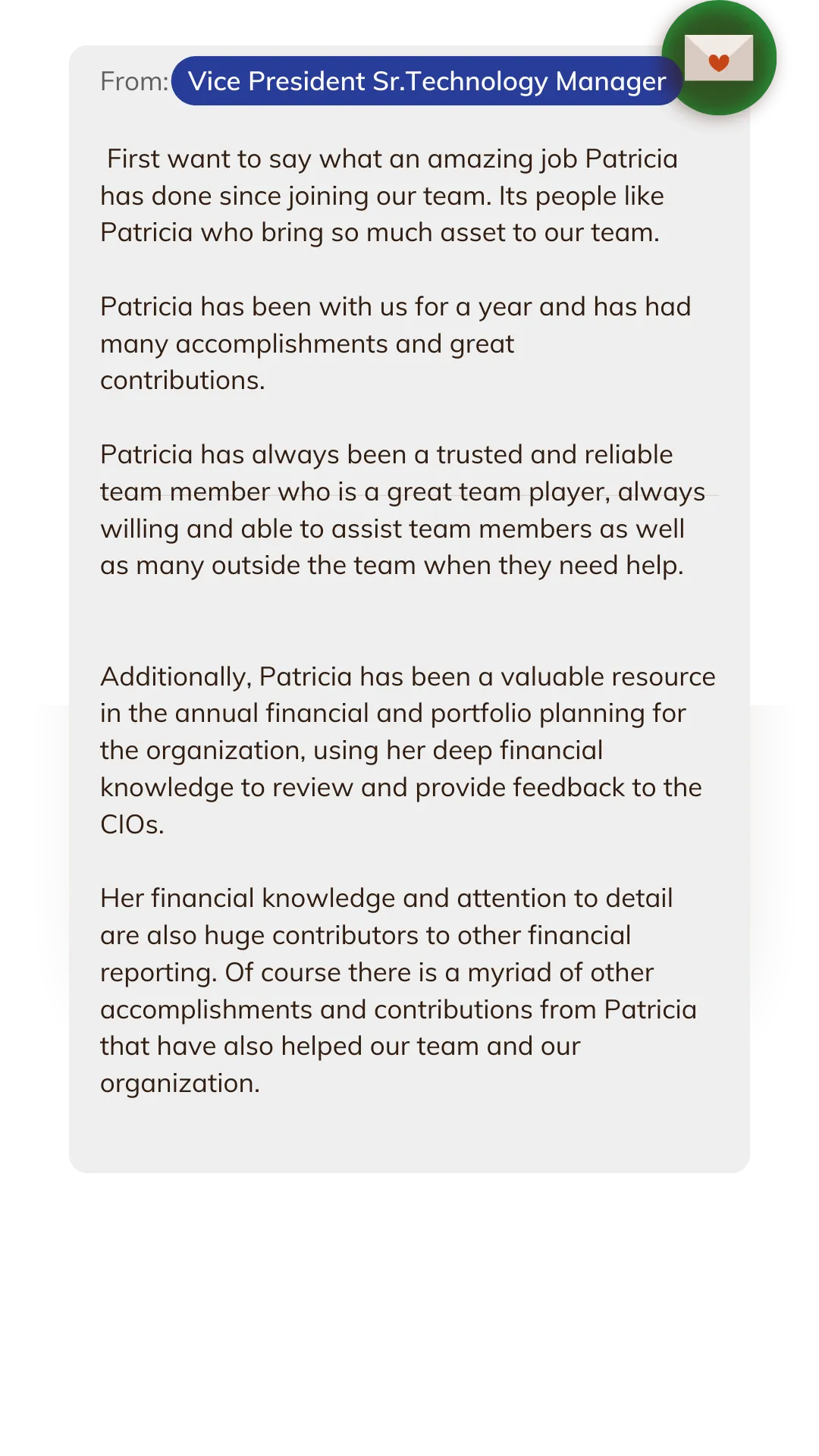 In other positions, Patricia has saved significant amounts of money for clients through credit card consolidation, approval forms for limit spend, process and procedures for use of funds, outsourcing new team members, and other measures.